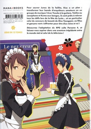 Une aventure trépidante entre le monde réel et celui de la télévision ! Pour sauver Junes de la faillite, Rise a un plan : transformer leur bande d'enquêteurs amateurs en un groupe de musique ! Avec Yosuke à la guitare, Yukiko au saxophone et Kuma aux bongos, ils sont prêts à relever tous les défis lors de la fête du lycée... et en particulier celui du concours de beauté de Miss Yasogami, où filles et garçons vont s'affronter pour être élus reine et roi ! Découvrez l'adaptation du RPG culte Persona 4, et laissez-vous aspirer dans une aventure trépidante entre le monde réel et celui de la télévision ! Série terminée en 13 tomes.