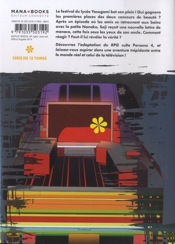 Une aventure trépidante entre le monde réel et celui de la télévision ! Le festival du lycée Yasogami bat son plein ! Qui gagnera les premières places des deux concours de beauté ? Après un épisode où les amis se retrouvent aux bains avec la petite Nanako, Soji reçoit une nouvelle lettre de menace, cette fois sous les yeux de son oncle. Comment réagir ? Faut-il lui révéler la vérité ? Découvrez l'adaptation du RPG culte Persona 4, et laissez-vous aspirer dans une aventure trépidante entre le monde réel et celui de la télévision ! Série terminée en 13 tomes.