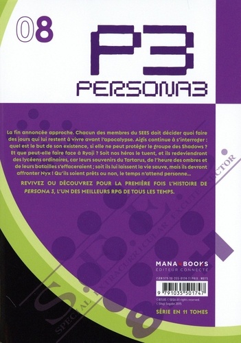 La fin annoncée approche. Chacun des membres du SEES doit décider quoi faire des jours qui lui restent à vivre avant l'apocalypse. Aitis continue à s'interroger quel est le but de son existence, si elle ne peut protéger le troupe des Shadows Et que peut-elle faire face à Ryoji ? Soit nos héros le tuent, et ils redeviendront des lycéens ordinaires, car leurs souvenirs du Tartarus, de l'heure des ombres e. de leurs batailles s'effaceraient ; soit ils lui laissent la vie sauve, mais ils devront affronter Nyx ! Qu'ils soient prêts ou non, le temps n'attend personne... REVIVEZ OU DECOUVREZ POUR LA PREMIERE FOIS L'HISTOIRE De PERSONA 3, L'UN DES MEILLEURS RPG DE TOUS LES TEMPS.
