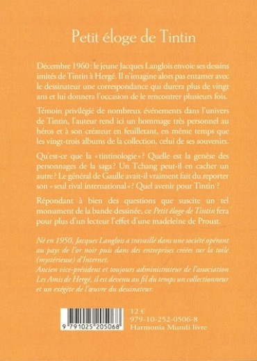 Décembre 1960 : le jeune Jacques Langlois envoie ses dessins imités de Tintin à Hergé. Il n'imagine alors pas entamer avec le dessinateur une correspondance qui durera plus de vingt ans et lui donnera l'occasion de le rencontrer plusieurs fois. Témoin privilégié de nombreux événements dans l'univers de Tintin, l'auteur rend ici un hommage très personnel au héros et à son créateur en feuilletant, en même temps que les vingt-trois albums de la collection, celui de ses souvenirs. Qu'est-ce que la "tintinologie" ? Quelle est la genèse des personnages de la saga ? Un Tchang peut-il en cacher un autre ? Le général de Gaulle avait-il vraiment fait du reporter son "seul rival international" ? Quel avenir pour Tintin ? Répondant à bien des questions que suscite un tel monument de la bande dessinée, ce Petit éloge de Tintin fera pour plus d'un lecteur l'effet d'une madeleine de Proust. Né en 1950, Jacques Langlois a travaillé dans une société opérant au pays de l'or noir puis dans des entreprises créées sur la toile (mystérieuse) d'Internet. Ancien vice-président et toujours administrateur de l'association Les Amis de Hergé, il est devenu au fil du temps un collectionneur et un exégète de l'oeuvre du dessinateur.