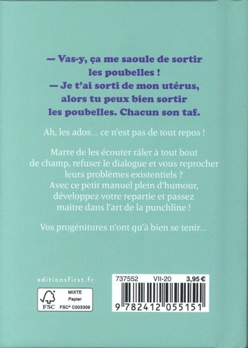 - Vas-y, ça me saoule de sortir les poubelles ! - Je t'ai sorti de mon utérus, alors tu peux bien sortir les poubelles. Chacun son taf. Ah, les ados : ce n'est pas de tout repos ! Marre de les écouter râler à tout bout de champ, refuser le dialogue et vous reprocher leurs problèmes existentiels ? Avec ce petit manuel plein d'humour, développez votre repartie et passez maître dans l'art de la punchline ! Vos progénitures n'ont qu'à bien se tenir...