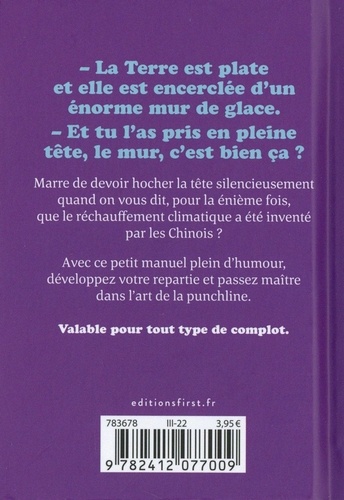 Parce qu'il y a forcément un complotiste autour de vous, apprenez à les prendre de court avant de, vous aussi, vous mettre à croire que la Terre est plate ! La Terre est plate et elle est encerclée d'un énorme mur de glace. Et tu l'as pris en pleine tête, le mur, c'est bien ça ? Marre de devoir hocher la tête silencieusement quand on vous dit, pour la énième fois, que le réchauffement climatique a été inventé par les Chinois ? Avec ce petit manuel plein d'humour, développez votre repartie et passez maître dans l'art de la punchline. Valable pour tout type de complot. Retrouvez de superbes punchlines, des QCM, des astuces, des citations et des fun facts (pas toujours véridiques) !