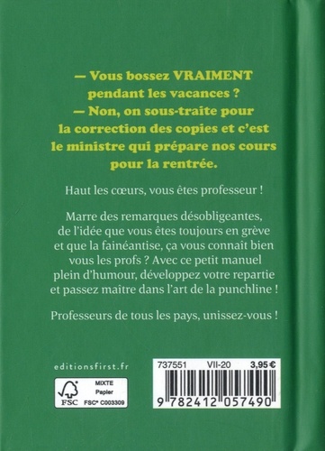 Développez votre repartie pour enfin savoir répondre avec humour et esprit à ceux qui pensent qu'être prof, c'est être en vacances 6 mois de l'année ! Un petit manuel de survie haut en couleurs pour savoir se défendre en toute situation et rire un bon coup. Parce que l'humour est souvent la solution pour se convaincre que " oui, j'ai toujours voulu faire ce métier magnifique " ! - ; Ah, ces profs, encore en vacances, pendant que les autres travaillent ! - ; Oui, et avec tes impôts, d'ailleurs. Du coup, c'est comme si tu autofinançais la carte postale que je t'enverrai. - ; Ils ont dit à la télé que vous aviez un logement de fonction, des tickets-restaurant et une réduction d'impôts ! - ; Ils ont oublié la limousine, le majordome et les réductions sur les anxiolytiques ! Retrouvez des super punchlines, des QCM, des astuces, des citations et des fun facts (pas toujours véridique) !