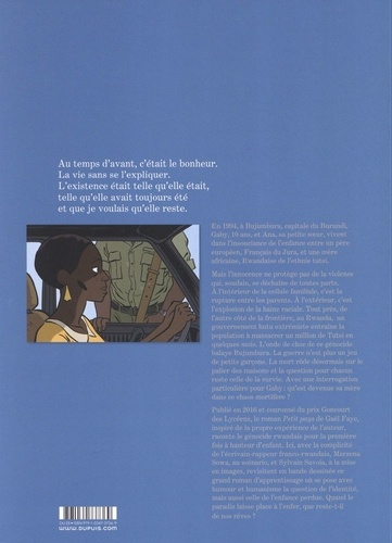 Au temps d'avant, c'était le bonheur. La vie sans se l'expliquer. L'existence était telle qu'elle était, telle qu'elle avait toujours été et que je voulais qu'elle reste. En 1994, à Bujumbura, capitale du Burundi. Gaby, 10 ans, et Ana, sa petite soeur, vivent dans l'insouciance de l'enfance entre un père européen, Français du Jura, et une mère africaine, Rwandaise de l'ethnie tutsi. Mais l'innocence ne protège pas de la violence qui, soudain, se déchaîne de toutes parts. A l'intérieur de la cellule familiale, c'est la rupture entre les parents. A l'extérieur, c'est l'explosion de la haine raciale. Tout près, de l'autre côté de la frontière, au Rwanda, un gouvernement hutu extrémiste entraîne la population à massacrer un million de Tutsi en quelques mois. L'onde de choc de ce génocide balaye Bujumbura. La guerre n'est plus un jeu de petits garçons. La mort rôde désormais sur le palier des maisons et la question pour chacun reste relie de la survie. Avec une interrogation particulière pour Gaby : qu'est devenue sa mère dans ce chaos mortifère ? Publié en 2016 et couronné du prix Goncourt des lycéens, le roman Petit pays de Gaël Faye, inspiré de la propre expérience de l'auteur, raconte le génocide rwandais pour la première fois à hauteur d'enfant. Ici, avec la complicité de l'écrivain-rappeur franco-rwandais Marzena Sowa, au scénario, et Sylvain Savoia à la mise en images revisitent en bande dessinée ce grand roman d'apprentissage où se pose avec humour et humanisme la question de l'identité, mais aussi celle de l'enfance perdue. Quand le paradis laisse place à l'enfer, que reste-t-il de nos rêves ?