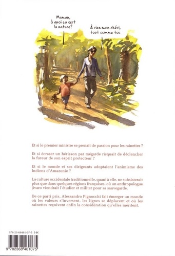 Et si le premier ministre se prenait de passion pour les rainettes ? Et si écraser un hérisson par mégarde risquait de déclencher la fureur de son esprit protecteur ? Et si le monde et ses dirigeants adoptaient l'animisme des Indiens d'Amazonie ? La culture occidentale traditionnelle, quant à elle, ne subsisterait plus que dans quelques régions françaises, où un anthropologue jivaro viendrait l'étudier et militer pour sa sauvegarde. De ce parti pris, Alessandro Pignocchi fait émerger un monde où les valeurs s'inversent, les lignes se déplacent et où les rainettes reçoivent enfin la considération qu'elles méritent.