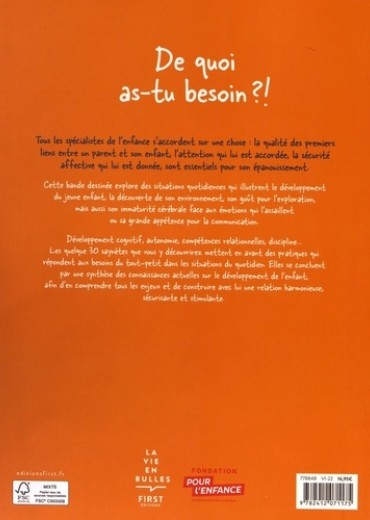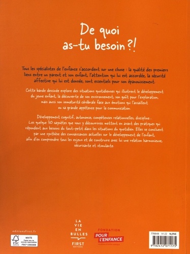 Une BD pour mieux comprendre le développement de son enfant et s'engager sur la voie de la parentalité éclairée et bienveillante. Tous les spécialistes de l'enfance s'accordent sur une chose : écouter attentivement et dialoguer avec l'enfant est essentiel pour son développement et pour construire une relation parent-enfant saine, stable, sécurisante et rassurante dès son plus jeune âge. Etre parent, c'est aussi comprendre ses propres émotions en tant qu'adulte, car les émotions nous guident, forment une boussole dans notre vie de tous les jours. Nos émotions sont ressenties et parfois même imitées par les enfants. Ils expriment leurs émotions mais ne sont pas capables de les gérer avant l'âge de 6 ou 7 ans. L'adulte peut, à l'inverse, tenter de gérer l'expression de ses propres émotions lorsqu'il s'adresse à son enfant dans certaines situations. Cette BD raconte des situations quotidiennes du point de vue de l'enfant pour montrer comment se déroule la découverte de son environnement, son goût pour l'exploration, ou encore comment parfois son cerveau est sur-stimulé par des bruits, couleurs, odeurs, ou mouvements. Développement cognitif, autonomie, compétences relationnelles, comportement social... Les 30 saynètes de cette bande dessinée mettent en avant des pratiques qui répondent aux besoins de l'enfant et des réactions à adopter dans les situations du quotidien, et se concluent par une synthèse des connaissances actuelles sur le développement psychologique et cognitif de l'enfant afin d'en comprendre tous les enjeux.