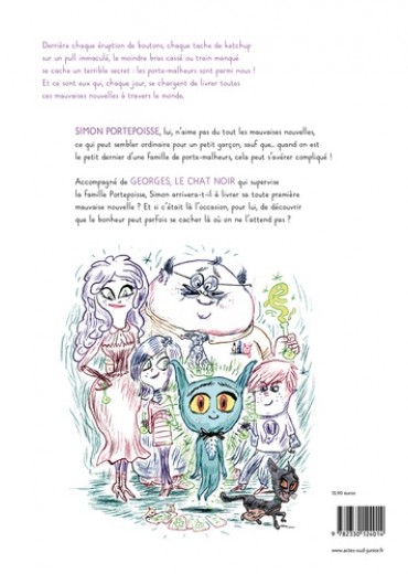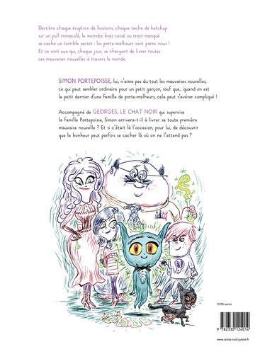 Aujourd'hui est un grand jour, car le petit Simon, dernier né d'une famille des Porte Malheurs, va devoir livrer son premier ticket-poisse ! Accompagné de Monsieur Georges, le chat noir chargé de superviser sa mission, Simon doit faire annuler le départ en vacances de la famille Chouquette ! Mais cette famille, qui semble tout droit sortie d'un magazine, cache bien des secrets ; aucun des membres de la famille n'est content en réalité de ce départ en vacances, au désespoir de Monsieur Georges qui ne voit pas comment livrer le ticket-poisse dans ces conditions ! Touché par cette situation, le gentil Simon va multiplier les efforts pour que cette famille retrouve l'envie de passer du temps ensemble. Même si cela doit faire capoter sa première mission... Mais attention, quand un Porte-Malheur se promène dans les parages, les problèmes ne sont jamais bien loin ! Et si, sans le savoir, Simon était un prodige des mauvaises nouvelles ?