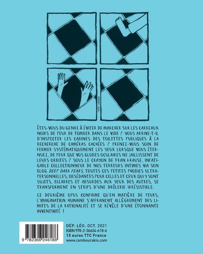 Etes-vous du genre à éviter de marcher sur les carreaux noirs de peur de tomber dans le vide ? Vous arrive-t-il d'inspecter les cabines des toilettes publiques à la recherche de cameras cachées ? Prenez-vous soin de fermer systématiquement les yeux lorsque vous éternuez, de peur que vos globes oculaires ne jaillissent de leurs orbites ? Sous le crayon de Fran Krause, infatigable collectionneur de nos terreurs intimes via son blog deep dark fears. Toutes ces petites phobies ultra-personnelles, obsédantes pour celles et ceux qui sont sujets, bizarres et absurdes aux yeux des autres, se transforment en suifs d'une drôlerie irrésistible. ce deuxième opus confirme qu'en matière de peurs, l'imagination humaine s'affranchit allégrement des limites de la rationalité et se révèle d'une étonnante inventivité !