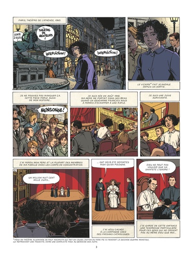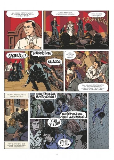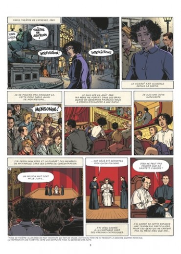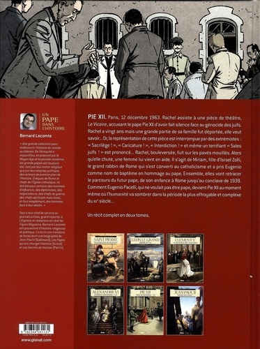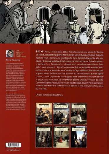 PIE XII. Paris, 12 décembre 1963. Rachel assiste à une pièce de théâtre, Le Vicaire, accusant le pape Pie XII d'avoir fait silence face au génocide des juifs. Rachel a vingt ans mais une grande partie de sa famille fut déportée, elle veut savoir...Or, la représentation de cette pièce est interrompue par des extrémistes : "Sacrilège ! ", "Caricature ! ", "Interdiction ! " et même un terrifiant "Sales juifs ! " est prononcé... Rachel, bouleversée, fuit sur les pavés mouillés. Alors qu'elle chute, une femme lui vient en aide. Il s'agit de Miriam, fille d'Israël Zolli, le grand rabbin de Rome qui s'est converti au catholicisme et a pris Eugenio comme nom de baptême en hommage au pape. Ensemble, elles vont retracer le parcours du futur pape, de son enfance à Rome jusqu'au conclave de 1939. Comment Eugenio Pacelli, qui ne voulait pas être pape, devient Pie XII au moment même où l'humanité va sombrer dans la période la plus effroyable et complexe du XXe siècle...