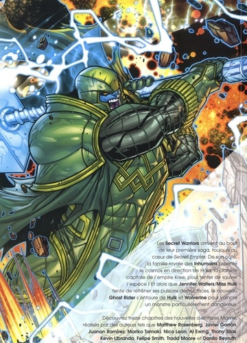 Retrouvez la suite des aventures des Inhumains dans Secret Warriors et dans Royals. La série Hulk sur les aventures de Jennifer Walters poursuit son cours, tandis que la mini-série Ghot Rider avec Hulk, Silk et Wolverine en guest-star, arrive à son terme.