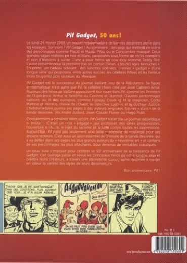 Le lundi 24 février 1969, un nouvel hebdomadaire de bandes dessinées arrive dans les kiosques. Son nom ? Pif Gadget ! Au sommaire : des gags qui mettent en scène des personnages comme Placid et Muzo, Pifou ou le Concombre masqué. Deux grandes sagas réalistes en noir et blanc, proposées sous forme de récits complets et non d'histoires à suivre. L'une a pour héros un cow-boy nommé Teddy Ted. L'autre présente pour la première fois un certain Rahan, "fils des âges farouches". En prime, un cadeau sidérant : des lunettes sidérales, premier "gadget" d'une longue série qui proposera, entre autres succès, les célèbres Pifises et les fameux (mais bruyants) pois sauteurs du Mexique. Pif Gadget est le successeur du journal Vaillant, issu de la Résistance. Sa figure emblématique n'est autre que Pif, le célèbre chien créé par José Cabrero Arnal. Plusieurs des héros de Vaillant poursuivent leur route dans Pif, comme les Pionniers de l'Espérance, Arthur le fantôme ou Corinne et Jeannot. D'autres personnages naîtront, au fil des numéros, comme l'oiseau Couik et M le magicien, Corto Maltese et Horace, cheval de l'Ouest, le détective Ludovic et le docteur Justice. L'hebdomadaire ouvrira ses pages à des auteurs originaux, futures "stars" de la bande dessinée, tels André Juillard, Jean-Claude Poirier ou Hugo Pratt. Contrairement à certaines idées reçues, Pif Gadget n'était pas un journal idéologique ni militant. C'était un titre "engagé" qui professait des idées progressistes, l'ouverture à l'Autre, le rejet du racisme et la lutte contre toutes les oppressions. Aujourd'hui, Pif n'est pas seulement une belle madeleine de nostalgie pour ses anciens lecteurs. C'est aussi un jalon essentiel de l'histoire de la bande dessinée, qui a vu défiler dans ses pages les plus grands auteurs du "neuvième art" et certains de ses personnages les plus attachants, tous devenus de véritables classiques. Un beau livre s'imposait pour célébrer le 502 anniversaire de la naissance de Pif Gadget. Cet ouvrage passe en revue les principaux héros de cette longue saga et célèbre leurs créateurs, à travers une abondante iconographie destinée à mettre en valeur la variété des styles de leurs dessinateurs. Bon anniversaire, Pif !