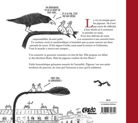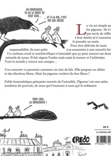 La vie est simple pour les pigeons. Ils n'ont pas envie de réfléchir à leur destin et encore moins à comment le prendre en main. Pour être délivrés de toute responsabilité, ils sont même prêts à se soumettre à une autorité forte. Un corbeau cruel et machiavélique n'attendait que ça pour exercer ses dons naturels de tyran. Il fait régner l'ordre mais aussi la terreur et l'arbitraire. Tout le monde y trouve son compte... Une mouette va pourtant contester ce pouvoir et la manière de le gérer. Elle propose un débat et des élections libres. Mais les pigeons ont-ils envie de liberté ? L'utilisation de personnages animaliers évoque évidemment les grands fabulistes et ce récit politico-philosophique imprégné d'humour noir peut en revendiquer l'héritage. Il y est question de démocratie, de manipulation des masses et de libre arbitre. Tout en nous déridant, son auteur, fort de son expérience de dessinateur de presse, réussit à nous questionner, voire à nous bousculer.