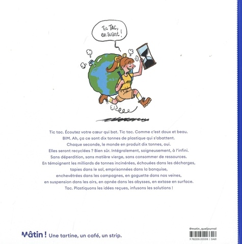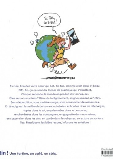 Tic tac. Ecoutez votre coeur qui bat. Tic tac. Comme c'est doux et beau. BIM. Ah, ça ce sont dix tonnes de plastique qui s'abattent. Chaque seconde, le monde en produit dix tonnes, oui. Elles seront recyclées ? Bien sûr. Intégralement, soigneusement, à l'infini. Sans déperdition, sans matière vierge, sans consommer de ressources. En témoignent les milliards de tonnes incinérées, échouées dans les décharges, tapies dans le sol, emprisonnées dans la banquise, enchevêtrées dans les campagnes, en goguette dans nos veines, en suspension dans les airs, en apnée dans les abysses, en extase en surface. Tac. Plastiquons les idées reçues, infusons les solutions !