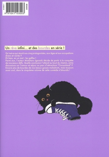 Qu'est-ce qui réunit nos cinq protagonistes, aux âges et aux occupations divers et variés ? Eh bien, en un mot : les gaffes ! Parmi eux, l'auteur Motoharu Igarashi décide de partir à la conquête de nouveaux défis. Quelle conclusion l'attend au bout du chemin, entre discussions sur l'amour et séjour au parc d'attractions "Oursonland" ? Encore plus de bourdes de nos beaux gosses maladroits, mais toujours aussi cool, dans le cinquième volume de cette comédie d'étourdis !