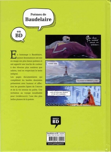 En hommage à Baudelaire, quinze dessinateurs ont mis en image ses plus beaux poèmes et ont apporté une touche de couleur à des rêveries plus sombres que sobres, tout en respectant le texte intégral. Les pages documentaires qui complètent les bandes dessinées présentent avec humour et affection les grandes lignes de l'oeuvre et de la vie intense du poète. Une invitation au voyage inoubliable pour (re)découvrir l'une des plus belles plumes de la poésie.