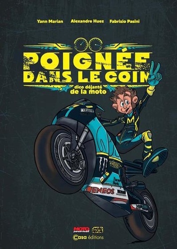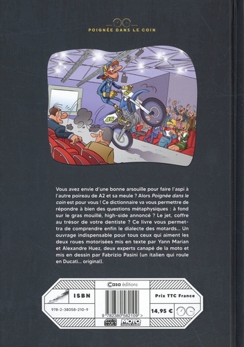 Vous avez envie d'une bonne arsouille pour faire l'aspi à l'autre poireau de A2 et sa meule ? Alors Poignée dans le coin est pour vous ! Ce dictionnaire va vous permettre de répondre à bien des questions métaphysiques : à fond sur le gras mouillé, high-side annoncé ? Le jet, coffre au trésor de votre dentiste ? Ce livre vous permettra de comprendre enfin le dialecte des motards... Un ouvrage indispensable pour tous ceux qui aiment les deux roues motorisées mis en texte par Yann Marian et Alexandre Huez, deux experts canapé de la moto et mis en dessin par Fabrizio Pasini (un italien qui roule en Ducati... original).