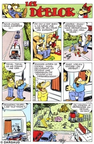 Une fois de plus, les Déblok ne vivent pas les choses à moitié ! Arrive, via la télé, la mode des baskets Monsters et les voilà, casquettes à l'envers, Monsters complets ! Arrivent les vacances ? Tonton Marcel le charcutier propose son camping-car, la famille saute sur l'aubaine, et, choc ! Honte ! Un énorme cochon rose trône sur le toit de l'engin. Que faire pour s'en débarrasser ? Les Déblok ont leurs idées, toujours loufoques !