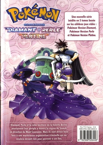 Suivez la grande aventure de Diamant et Perle, deux Dresseurs qui se sont promis de réaliser leurs rêves ! (Volume 2/5) Diamant, Perle et la riche héritière de la famille berlitz poursuivent leur préiple à travers la région de Sinnoh en direction du Mont Couronné. Mais ils vont devoir faire face à une msytérieuse organisation criminelle qui ne reculera devant rien pour parvenir à ses fins.