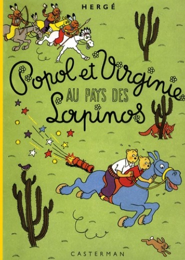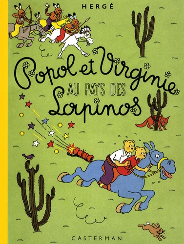 C'est en 1934 que paraissent pour la première fois les aventures de Popol et Virginie au pays des Lapinos, dans Le Petit Vingtième. Une fantaisie animalière narrant les aventures au Far West d'un chapelier, l'ourson Popol, flanqué de sa Virginie, qu'Hergé relate dans un style à la fois naïf et enjoué. Ce n'est qu'en 1948 qu'il en reprend les soixante planches. Mises en couleurs, elles paraissent dans le journal Tintin. L'album sort en 1952, à la même époque que les albums de JO ET ZETTE. Contrairement à ces derniers, publiés sur le modèle des albums de TINTIN, Popol et Virginie est proposé au même format réduit que les QUICK ET FLUPKE, sous une couverture souple et reliure "économique" avec agrafes en métal. En 1968, l'album est mis au format habituel des bandes dessinées, avec des planches agrandies, une couverture refaite et un titre légèrement modifié en Popol et Virginie chez les Lapinos. Epuisé quelques temps, l'ouvrage est à nouveau disponible sous une nouvelle présentation : dos toilé jaune et papier à l'ancienne, reprise de la couverture verte d'origine. Dans la lignée des désormais célèbres FAC-SIMILES développés pour les aventures de TINTIN, le charme inimitable des albums à l'ancienne.