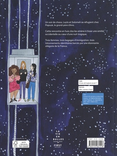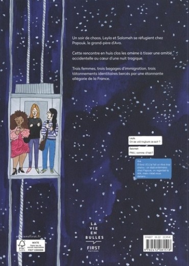 Un soir de chaos, Leyla et Salomeh se réfugient chez Papouk, le grand-père d'Ava. Cette rencontre en huis clos les amène à tisser une amitié accidentelle au coeur d'une nuit tragique. Trois femmes, trois bagages d'immigration, trois tâtonnements identitaires bercés par une étonnante allégorie de la France. Ce roman graphique est le premier ouvrage de ses quatre autrices. Le scénario a été coécrit par Inès, Kenza et Saena, les dessins sont l'oeuvre d'Odélia et les calligraphies celle de Saena. (une nuit) est né en décembre 2015, comme une évidence, au détour d'une conversation WhatsApp qui incitera Inès, Kenza et Saena à collecter précieusement leurs fulgurances et inconstances identitaires. L'envie de raconter ces histoires dans un livre devient rapidement irrésistible. Dans la foulée, Odélia est embarquée dans cette aventure totalement autodidacte. Malgré la distance géographique, les décalages horaires et les confinements successifs, elles développent un processus créatif pour donner vie à ce projet artistique, politique et collectif porté par trois personnages : Ava, Leyla et Salomeh.