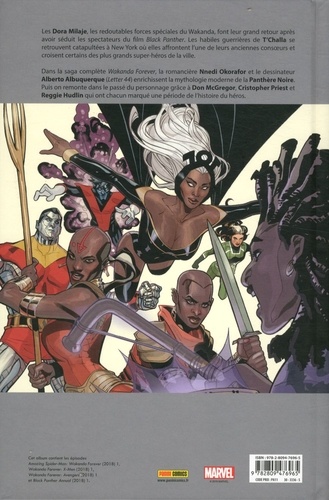 Les Dora Milaje, les redoutables forces spéciales du Wakanda, font leur grand retour après avoir séduit les spectateurs du film Black Panther. Les habiles guerrières de T'Challa se retrouvent catapultées à New York où elles affrontent l'une de leurs anciennes consoeurs et croisent certains des plus grands super-héros de la ville. Dans la saga complète Wakanda Forever, la romancière Nnedi Okorafor et le dessinateur Alberto Albuquerque (Letter44) enrichissent la mythologie moderne de la Panthère Noire. Puis on remonte dans le passé du personnage grâce à Don McGregor, Cristopher Priest et Reggie Hudlin qui ont chacun marqué une période de l'histoire du héros.