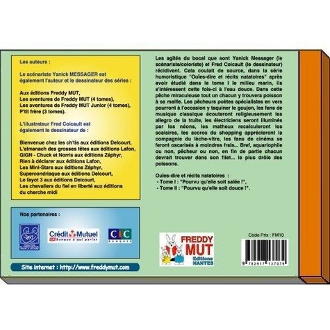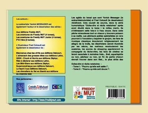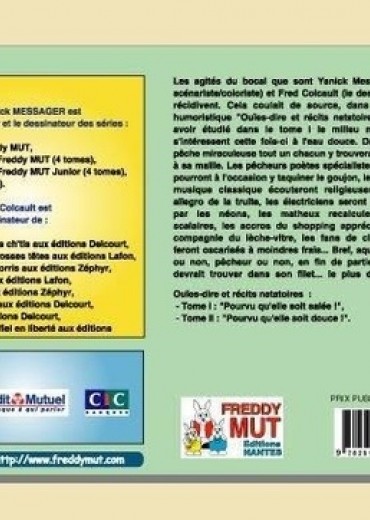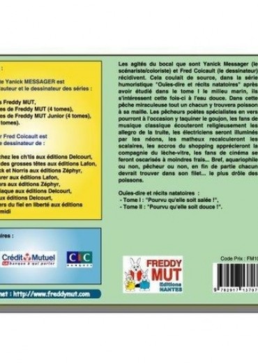 Les agités du bocal que sont Yanick Messager (le scénariste/coloriste) et Fred Coicault (le dessinateur) récidivent. Cela coulait de source, dans la série humoristique "Ouïes-dire et récits natatoires" après avoir étudié dans le tome I le milieu marin, ils s'intéressent cette fois-ci à l'eau douce. Dans cette pêche miraculeuse tout un chacun y trouvera poisson à sa maille. Les pêcheurs poètes spécialistes en vers pourront à l'occasion y taquiner le goujon, les fans de musique classique écouteront religieusement les allegro de la truite, les électriciens boutonneux seront illuminés par les néons, les matheux recalculeront les scalaires, les accros du shopping apprécieront la compagnie du lèche-vitre, les fans de cinéma se feront oscarisés à moindres frais... Bref, aquariophile ou non, pêcheur ou non, en fin de partie chacun devrait trouver dans son filet... le plus drôle des poissons.