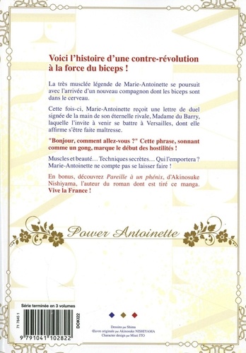 Voici l'histoire d'une contre-révolution à la force du biceps ! La très musclée légende de Marie-Antoinette se poursuit avec l'arrivée d'un nouveau compagnon dont les biceps sont dans le cerveau. Cette fois-ci, Marie-Antoinette reçoit une lettre de duel signée de la main de son éternelle rivale, Madame du Barry, laquelle l'invite à venir se battre à Versailles, dont elle affirme s'être faite maîtresse. "Bonjour, comment allez-vous ? " Cette phrase, sonnant comme un gong, marque le début des hostilités ! Muscles et beauté... Techniques secrètes... Qui l'emportera ? Marie-Antoinette ne compte pas se laisser faire ! En bonus, découvrez Pareille à un phénix, d'Akinosuke Nishiyama, l'auteur du roman dont est tiré ce manga. Vive la France !