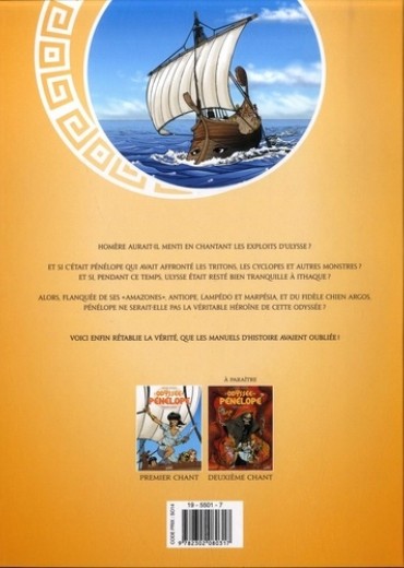 Et si c'était Pénélope qui avait affronté les Tritons, les Cyclopes et autres monstres ? Et si pendant ce temps, Ulysse était resté bien peinard à Ithaque à faire et défaire un machintrucbazar pour éviter de devoir prendre une autre épouse ? Alors, flanquée de ses "Amazones" , Antiope, Lampédo et Marpésia, et du fidèle chien Argos, Pénélope aurait été l'héroïne d'une palpitante croisière qui ne s'amuse pas toujours !