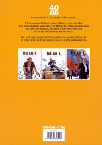 A l'occasion de leur quarantième anniversaire, Les Humanoïdes Associés rééditent des titres marquants de leur catalogue, assortis d'une postface ou d'un entretien avec les auteurs. Cet ouvrage reprend l'intégralité de la série Milan K et a fait l'objet d'un tirage limité à 2000 exemplaires.