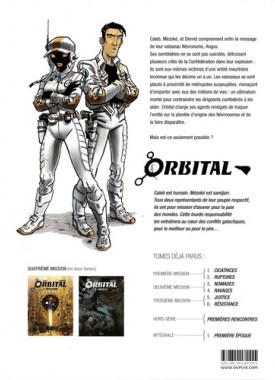 Orbital, gigantesque cité-satellite rassemblant des centaines de peuples aliens, est le centre névralgique de la Confédération. A l'abri d'immenses portes Crop, son Office Diplomatique Intermondial dirige le destin de la Galaxie et veille au respect des accords entre chaque monde. Caleb est Humain. Mézoké est Sandjarr. Tous les deux ont prononcé leurs voeux d'allégeance : ils sont désormais agents de paix de l'ODI. Quinze ans après les violents affrontements qui ont opposé leur peuple respectif, leur binôme est un précieux symbole que leurs premières missions vont mettre à rude épreuve...