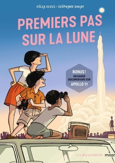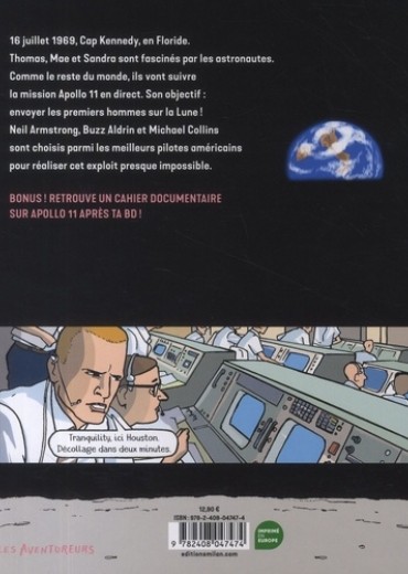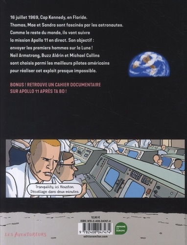 Apollo 11, une bande dessinée de la nouvelle collection "Les aventureurs", à partir de 7 ans ! USA, 1969, base de lancement de la fusée Saturn V, en Floride. Thomas, Mae et Sandra, trois enfants qui campent en face de Cap Kennedy avec leur famille, suivent de très près le décollage de la mission Apollo 11. A travers leurs yeux, la bande dessinée se veut particulièrement immersive. Les heures s'écoulent, rythmées par la télévision et la radio qui relayent cet événement. Le monde entier retient son souffle... Comme toute leur génération, nos jeunes héros rêvent d'être astronautes et s'interrogent beaucoup sur le quotidien de leurs idoles : Neil Armstrong, Buzz Aldrin et Michael Collins. Leur exploit, qui est aussi celui des Etats-Unis, va marquer l'humanité à jamais. Cette bande dessinée navigue avec humour entre les questionnements des enfants sur les astronautes et retrace l'incroyable mission "Apollo 11", qui verra l'homme poser le pied sur la lune pour la première fois ! Ce titre permet aussi de faire découvrir naturellement le contexte sociétal de l'époque, les relations mondiales au temps de la guerre froide et est complétée par un dossier documentaire bonus. "Apollo 11" réserve aux petits lecteurs une grande aventure spatiale !