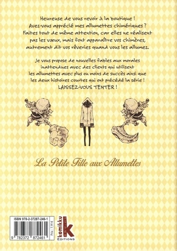 Heureuse de vous revoir à la boutique ! Avez-vous apprécié mes allumettes chimériques ? Faites tout de même attention, car elles ne réalisent pas les voeux, mais font apparaître vos chimères, autrement dit vos rêveries quand vous les allumez. Je vous propose de nouvelles fables aux morales inattendues avec des clients qui utilisent les allumettes avec plus ou moins de succès ainsi que les deux histoires courtes qui ont précédé la série ! Laissez-vous tenter !