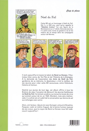 Il revit aujourd'hui à travers le talent de René Le Honzek, l'illustrateur bien connu de Torr'Pen et de l'Histoire de la Bretagne. A la demande de l'association des Amis de Noël du Fail, gardienne de sa mémoire, le dessinateur a tiré le meilleur de ses oeuvres pour créer cette BD savoureuse, entre littérature, histoire et humour. Destiné aux jeunes de tout âge, cet album offrira à tous les Bretons de coeur l'occasion de découvrir les oeuvres facétieuses de Noël du Fail. Ce lointain ancêtre a su transcrire la joie de vivre qui existait autour de lui, en 1520. Mordant, mais sans méchanceté, il a cultivé cet art subtil de la conversation qui donne du sel aux échanges avec autrui. Alors, ami lecteur, réjouis-toi avec Eutrapel, entouré d'Anselme, Pasquier, Lubin et maître Huguet, de la bonne humeur joyeuse de ces ruraux, que le crayon de René Le Honzec nous fait redécouvrir aujourd'hui !