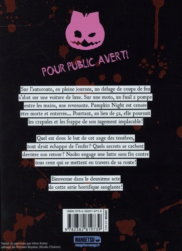 Sur l'autoroute, en pleine journée, un déluge de coups de feu s'abat sur une voiture de luxe. Sur une moto, un fusil à pompe entre les mains, une revenante. Pumpkin Night est censée être morte et enterrée... Pourtant, au lieu de ça, elle poursuit les crapules et les frappe de son jugement implacable ! Quel est donc le but de cet ange des ténèbres, tout droit échappé de l'enfer ? Quels secrets se cachent derrière son retour ? Naoko engage une lutte sans fin contre tous ceux qui se mettent en travers de sa route ! Bienvenue dans le deuxième acte le cette série horrifique sanglante !