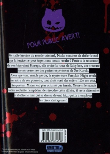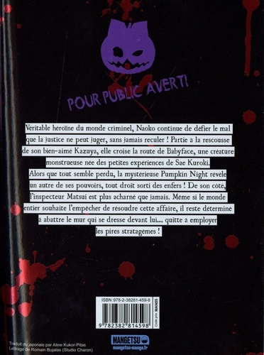 Véritable héroïne du monde criminel, Naoko continue de défier le mal que la justice ne peut juger, sans jamais reculer ! Partie à la rescousse de son bien-aimé Kazuya, elle croise la route de Babyface, une créature monstrueuse née des petites expériences de Sae Kuroki. Alors que tout semble perdu, la mystérieuse Pumpkin Night révèle un autre de ses pouvoirs, tout droit sorti des enfers ! De son côté, l'inspecteur Matsui est plus acharné que jamais. Même si le monde entier souhaite l'empêcher de résoudre cette affaire, il reste déterminé à abattre le mur qui se dresse devant lui... quitte à employer les pires stratagèmes !