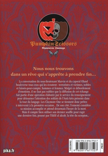 La conversation du sous-lieutenant Marvin et du caporal Oland bouleverse tous ceux qui les écoutent : terroristes et victimes, nobles et laissés-pour-compte, hommes et femmes. Malgré ce débordement d'émotions, il ne faut pas oublier que la diffusion de cet échange fait partie d'une opération élaborée par le service du renseignement pour détourner l'attention des soldats de l'Anti-Arès présents dans la tour du langage. Les Claymore One se tiennent donc prêtes à intervenir à la première occasion... De son côté, l'ennemi considère sa mission accomplie et attend désormais l'heure de la mort. Mais il compte bien utiliser son dernier souffle pour rugir une dernière fois, poussé par l'Iiklil al akrab, la tête du scorpion...