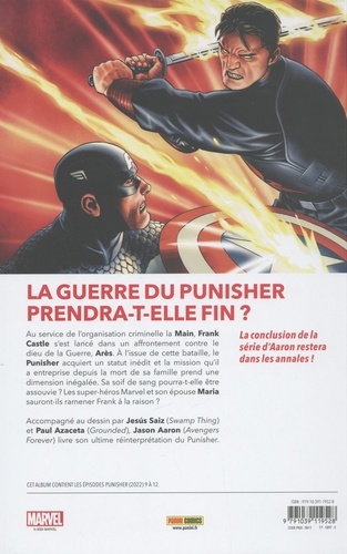 Le Punisher contre Arès : le combat final. Mais même si Frank Castle survit à l'assaut du Dieu de la Guerre, il va devoir affronter d'autres forces qui souhaitent le faire tomber une fois pour toutes... au risque de perdre son âme ? Est-ce Maria Castle qui tient la clé de la rédemption du terrible anti-héros ? Jason Aaron (Avengers) boucle la terrifiante saga qui a ressuscité Maria, la femme du Punisher, et dans laquelle Frank Castle a pris la tête des assassins de la Main. Une épopée sublimée par les dessins de Jesus Saiz (Captain America) pour les scènes du présent et Paul Azaceta (Daredevil) pour les flash-backs.
