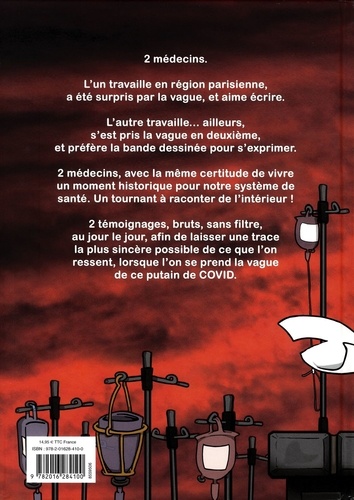 2 médecins. L'un travaille en région parisienne, a été surpris par la vague, et aime écrire. L'autre travaille... ailleurs, s'est pris la vague en deuxième, et préfère la bande dessinée pour s'exprimer. 2 médecins, avec la même certitude de vivre un moment historique pour notre système de santé. Un tournant à raconter de l'intérieur ! 2 témoignages, bruts, sans filtre, au jour le jour, afin de laisser une trace la plus sincère possible de ce que l'on ressent, lorsque l'on se prend la vague de ce putain de COVID.