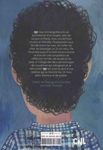 Qp nous immerge dans la vie quotidienne d'un couple, celui de Quique et Paola. Avec son écriture sincère et intimiste, Powerpaola nous fait découvrir les rues, les cafés, les villes, les paysages où ils ont vécu. De l'Australie jusqu'à la forêt amazonienne, ce livre est une compilation de réflexions intimes, de doutes et de joies, à l'image des deux personnages de couverture qui s'éloignent et se retrouvent. Qp est aussi le récit d'une relation qui se transforme. Un livre plein d'amour et de poésie.