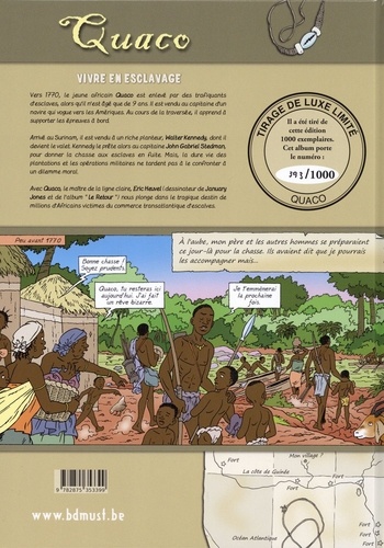 Vers 1770, le jeune africain Quaco est enlevé par des trafiquants d'esclaves, alors qu'il n'est âgé que de 9 ans. Il est vendu au capitaine d'un navire qui vogue vers les Amérique. Au cours de la traversée, il apprend à supporter les épreuves à bord. Arrivé au Surinam, il est vendu à un riche planteur, Walter Kennedy dont il devient le valet Kennedy le prête alors au capitaine John Gabriel Stedman, pour donner la chasse aux esclaves en fuite Mais, la dure vie des plantations et les opérations militaires ne tardent pas à le confronter à un dilemme moral. Avec Quaco, le maître de la ligne claire, Eric Heuvel (dessinateur de January Jones et de l'album "Le Retour") nous plonge dans le tragique destin de millions d'Africains victimes du commerce transatlantique d'esclaves.