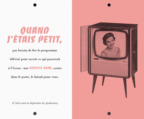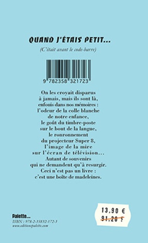 On les croyait disparus à jamais, mais ils sont là, enfouis dans nos mémoires : l'odeur de la colle blanche de notre enfance, le goût du timbre-poste sur le bout de la langue, le ronronnement du projecteur Super 8, l'image de la mire sur l'écran de télévision... Autant de souvenirs qui ne demandent qu'à resurgir. L'auteur est parti à la recherche de ces petits riens qui ont marqué son enfance, de ces minuscules vestiges aujourd'hui enfouis sous des années de changements et de progrès. Ceci n'est pas un livre : c'est une boîte de madeleines.
