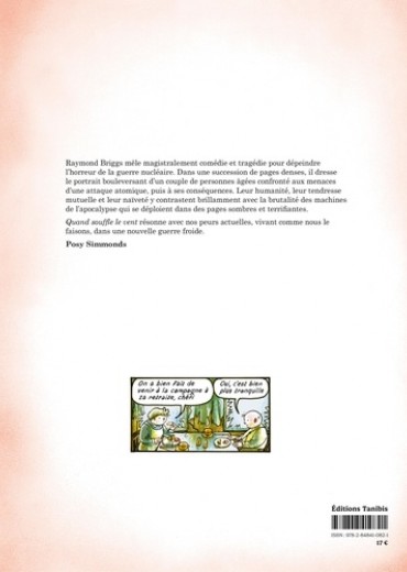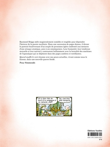 James et Hilda Bloggs coulent une retraite paisible dans leur jolie petite maison au milieu de la campagne anglaise. Ils sont tendres et n'ont l'un pour l'autre que des sourires et des mots doux. Leur quotidien s'écoule à un rythme tranquille, bien loin des soucis du vaste monde et des sourdes menaces de la guerre froide. Mais un jour, leur poste de radio relaie des informations alarmantes : tensions ravivées, frappes imminentes... "Préparez-vous, la Bombe arrive !! " , les prévient le gouvernement. Heureusement, James a rapporté de la bibliothèque un guide officiel de survie à une attaque atomique. Pas de panique donc, il suffit de suivre ses instructions le temps que l'alerte soit levée et tout rentrera dans l'ordre. A moins que ? ... Raymond Briggs, auteur britannique jusque-là connu pour ses albums jeunesse, fait paraître en 1982 cette évocation de l'apocalypse nucléaire mêlant tragédie et comédie. Charge féroce contre des Etats prêts à mettre en jeu la vie de toute une population pour gagner une confrontation internationale, Quand souffle le vent est toujours terriblement d'actualité. C'est également un récit intimiste d'une grande force émotionnelle. S'inspirant de ses propres parents, Briggs campe non sans une certaine causticité un couple de personnages aussi attachants que naïfs, mais toujours animés d'une force de vie qui les pousse à croire au meilleur, jusqu'à l'aveuglement.