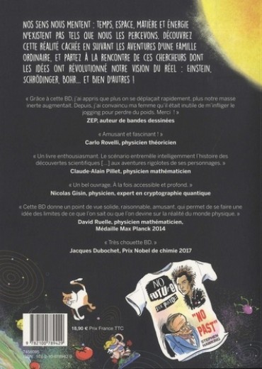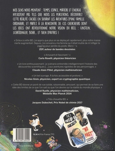 Nos sens nous mentent : temps, matière et énergie n'existent pas tels que nous les percevons. Découvrez cette réalité cachée en suivant les aventures d'une famille ordinaire, et partez à la rencontre de ces chercheurs dont les idées ont révolutionné notre vision du réel : Einstein, Schrödinger, Bohr... et bien d'autres ! "Grâce à cette BD, j'ai appris que plus on se déplaçait rapidement, plus notre masse inerte augmentait. Depuis, j'ai convaincu ma femme qu'il était inutile de m'infliger le jogging pour perdre du poids. Merci ! " ZEP, auteur de bandes dessinées "Amusant et fascinant ! " Carlo rovelli, physicien "Un livre enthousiasmant. Le scenario entremêle intelligemment l'histoire des découvertes scientifiques [... ] aux aventures rigolotes de ses personnages". Claude-Alain Pillet, mathématicien-physicien "Un bel ouvrage. A la fois accessible et profond". Nicolas Gisin, physicien, expert en cryptographie quantique "Cette BD donne un point de vue solide, raisonnable, amusant, qui permet de se faire une idée des limites de ce que l'on sait ou que l'on devine sur la réalité du monde physique". David Ruelle, mathématicien physicien, Médaille Max Planck 2014 "Très chouette BD". Jacques Dubochet, Prix Nobel de chimie 2017