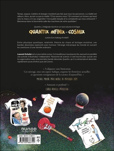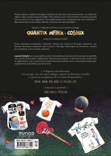 Temps, espace, matière et énergie n'existent pas tels que nous les percevons. La réalité est ailleurs. Alors, qu'est-ce que la réalité ? D'où venons-nous ? Et comment un Univers qui tend vers le chaos a-t-il pu engendrer l'incroyable beauté et la complexité qui nous entourent ? Bienvenue dans la fascinante salle des machines de votre quotidien ! Quantix, L'Intégrale réunit en un seul volume la trilogie Quantix, Infinix et Cosmix, suivie d'un making of inédit ! Entre physique quantique, relativité, théorie du chaos et biologie évolutive, ces bandes dessinées explorent avec humour l'étrange mécanique du monde en suivant les aventures d'une famille ordinaire. "A déguster sans limitation. Cet ouvrage, sous son aspect ludique, esquisse les frontières actuelles et questions vertigineuses de la science d'aujourd'hui". Michel Mayor, Prix Nobel de physique 2019 " Amusant et fascinant ! " Carlo rovelli, physicien