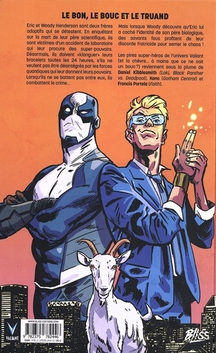 Le bon, le bouc et le truand. Eric et Woody Henderson sont deux frères adoptifs qui se détestent. En enquêtant sur la mort de leur père scientifique, ils sont victimes d'un accident de laboratoire qui leur procure des super-pouvoirs. Désormais, ils doivent "klanguer" leurs bracelets toutes les 24 heures, s'ils ne veulent pas être désintégrés par les forces quantiques qui leur donnent leurs pouvoirs. Lorsqu'ils ne se battent pas entre eux, ils combattent le crime... Mais lorsque Woody découvre qu'Eric lui a caché l'identité de son père biologique, des savants fous profitent de leur discorde fratricide pour semer le chaos ! Les pires super-héros de l'univers Valiant (et la chèvre... à moins que ce ne soit un bouc ? ) reviennent sous la plume de Daniel Kibblesmith (Loki, Black Panther vs. Deodpool, Kano (Gotham Central) et Francis Portela (Faith).