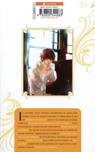 Ici Kyûtarô ! Nous sommes actuellement en route pour Byakko, Inoue de Suzaku a pénétré le village dans le but de s'emparer du cercueil, mais il est tombé dans le piège tendu par Sarara qui l'a entraîné avec elle en "enfer" ! Pour la secourir, je n'ai pas d'autre choix que de laisser ma place au serpent car lui sait ce qui nous attend dans cet endroit du monde intérieur, apparemment peuplé de redoutables créatures. Fumi est fâchée de cette décision... Toutefois, je sais que je peux compter sur elle pour veiller sur le serpent en mon absence ! J'espère que cette opération les rapprochera et permettra à Fumi de le découvrir réellement...