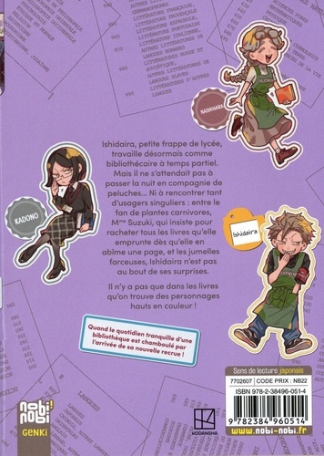 Ishidaira, petite frappe de lycée, travaille désormais comme bibliothécaire à temps partiel. Mais il ne s'attendait pas à y passer la nuit en compagnie de peluches... Ni à y rencontrer tant d'usagers singuliers : entre le fan de plantes carnivores, Mme Suzuki qui insiste pour racheter tous les livres qu'elle emprunte dès qu'elle en abîme une page, et les jumelles farceuses, Ishidaira n'est pas au bout de ses surprises. Il n'y a pas que dans les livres qu'on trouve des personnages hauts en couleur !