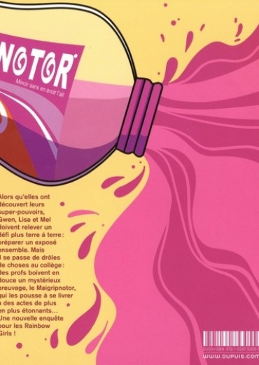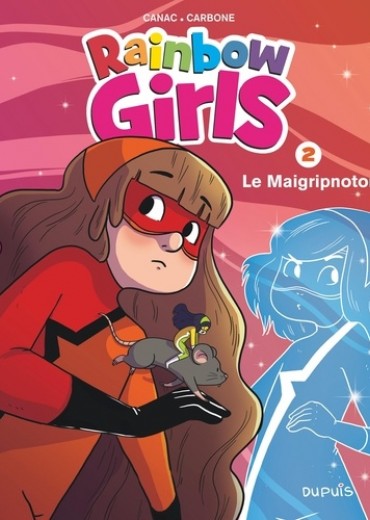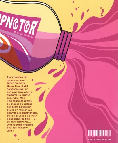 Maintenant qu'elles ont découvert que la morsure d'une plante carnivore leur avait donné des super-pouvoirs, Gwen, Lisa et Mel ? alias les Rainbow Girls ? relèvent un défi très terre-à-terre : faire un exposé ensemble ! Sauf qu'il se passe de drôles de choses au collège, avec des profs qui boivent en douce une étrange potion orange les faisant buguer et leur donnant les yeux rouges : le Maigripnotor, un breuvage nocif qui les pousse à se livrer à des actes de plus en plus étonnants... auxquels la police pourrait bien s'intéresser... Une nouvelle enquête pour les Rainbow Girls, dont les pouvoirs d'invisibilité, de changement de taille ou de communication avec les animaux ne seront pas de trop pour percer ce mystère ! Carbone, comme toujours, sort de son tiroir à idées une série jeunesse en phase avec les enfants d'aujourd'hui, où elle traite subtilement de thématiques de société actuelles. Complice parfaite, Canac lui apporte toute la fraîcheur de son trait.