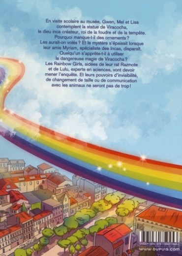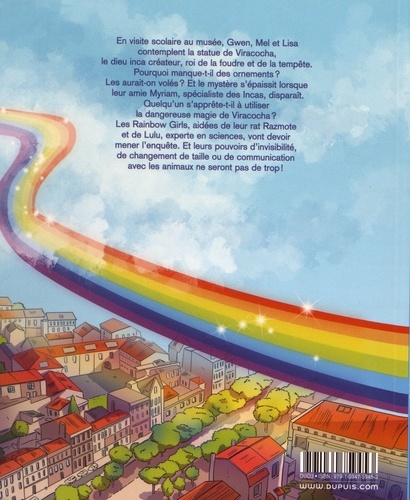 En visite scolaire au musée, Gwen, Mel et Lisa contemplent la statue de Viracocha, le dieu inca créateur, roi de la foudre et de la tempête. Pourquoi manque-t-il des ornements ? Les aurait-on volés ? Et le mystère s'épaissit lorsque leur amie Myriam, spécialiste des Incas, disparaît. Quelqu'un s'apprête-t-il à utiliser la dangereuse magie de Viracocha ? Les Rainbow Girls, aidées de leur rat Razmote et de Lulu, experte en sciences, vont devoir mener l'enquête. Et leurs pouvoirs d'invisibilité, de changement de taille ou de communication avec les animaux ne seront pas de trop !