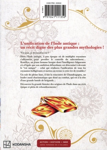 L'unification de l'Inde antique : un récit digne des plus grandes mythologies ! "Un jour, je deviendrai roi ! " Dans l'Inde antique, à une époque où de multiples royaumes s'affrontent pour prendre le contrôle du subcontinent... Kautilya, un jeune homme borgne dont l'intelligence fulgurante n'a d'égale que son ambition débordante est déterminé à devenir le "roi unique" - celui qui réalisera l'unification de tous les royaumes belligérants et mettra un terme à cette ère de troubles ! Un soir de pleine lune, il fait la rencontre de Chandragupta, un leader aussi charismatique que doué au combat, qui est à la tête d'une grande bande de brigands... Découvrez la grande histoire des origines de l'Inde dans un récit épique et plein de rebondissements !